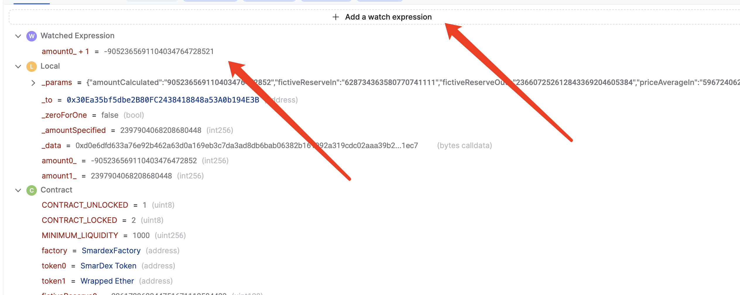 The debugger automatically shows the local variables within the call context, and all the contract variables.