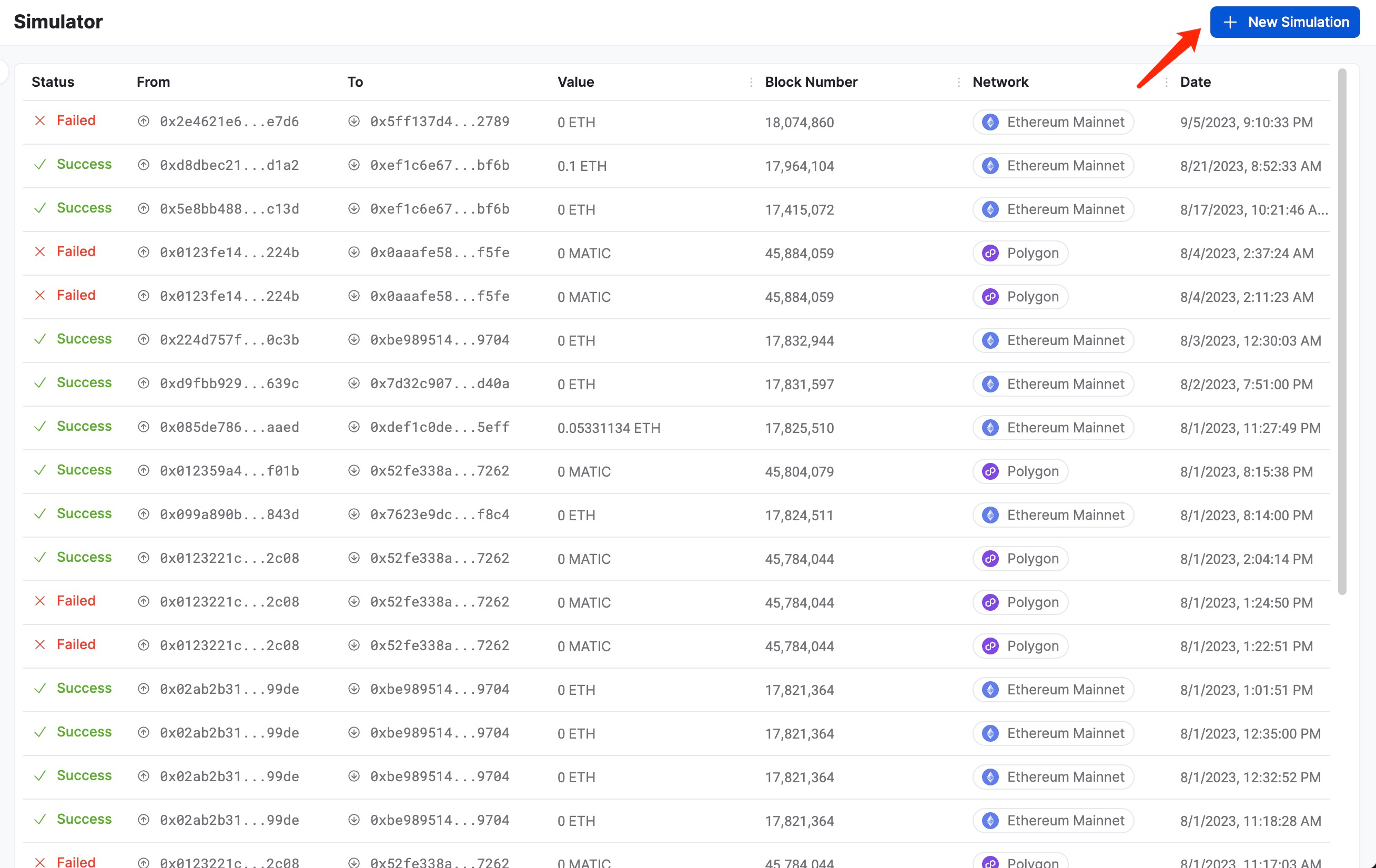 You can also click the simulator button on the left navigation bar and go to the simulator page which shows all the history simulations. Click the simulation button on the right corner will pop a similar UI but without prepopulated transaction data.