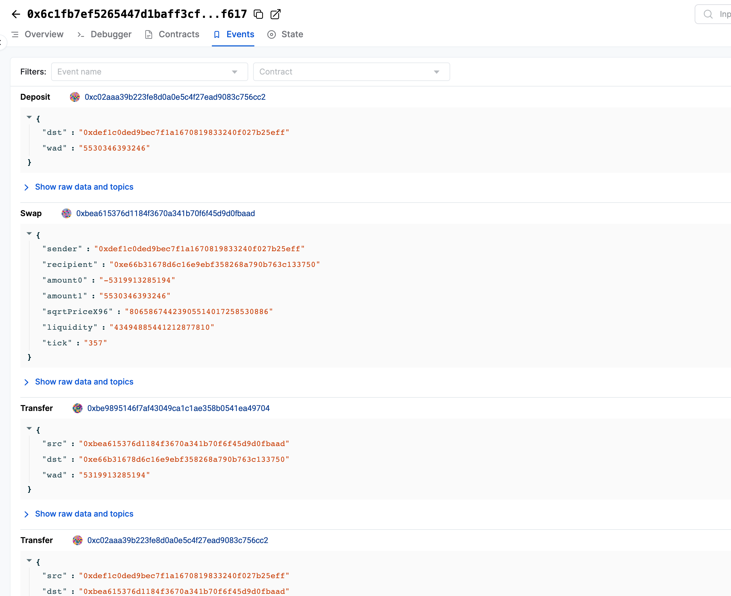 Events are decoded where ABIs are available, and are otherwise displayed according to best effort on the Events tab.
