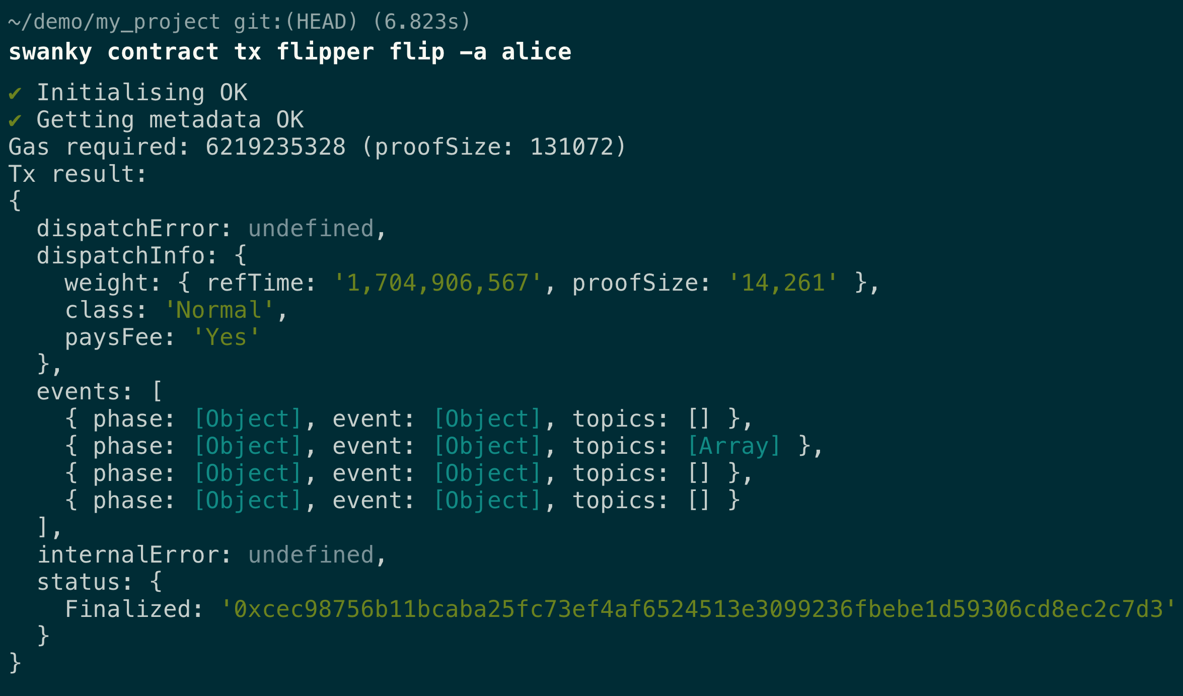 Successfully running the deploy command will print out the address your contract is deployed to, as well as save it into swanky.config.json