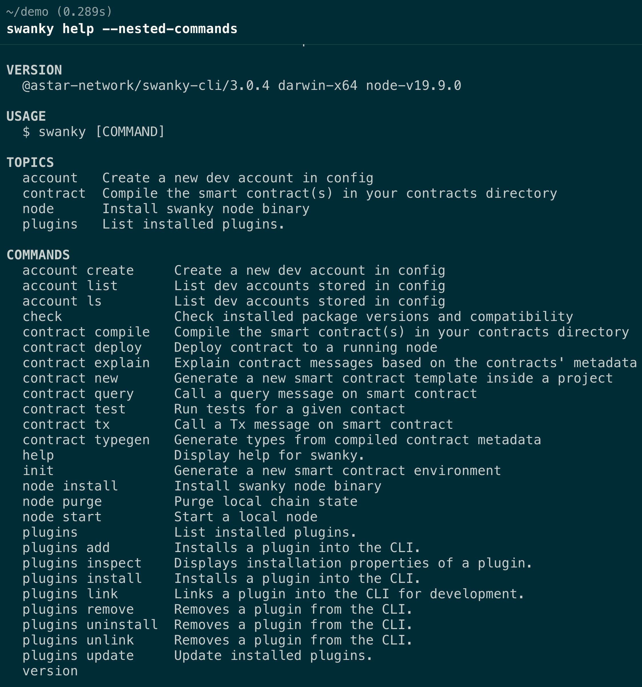 $ npx @astar-network/swanky-cli [command]