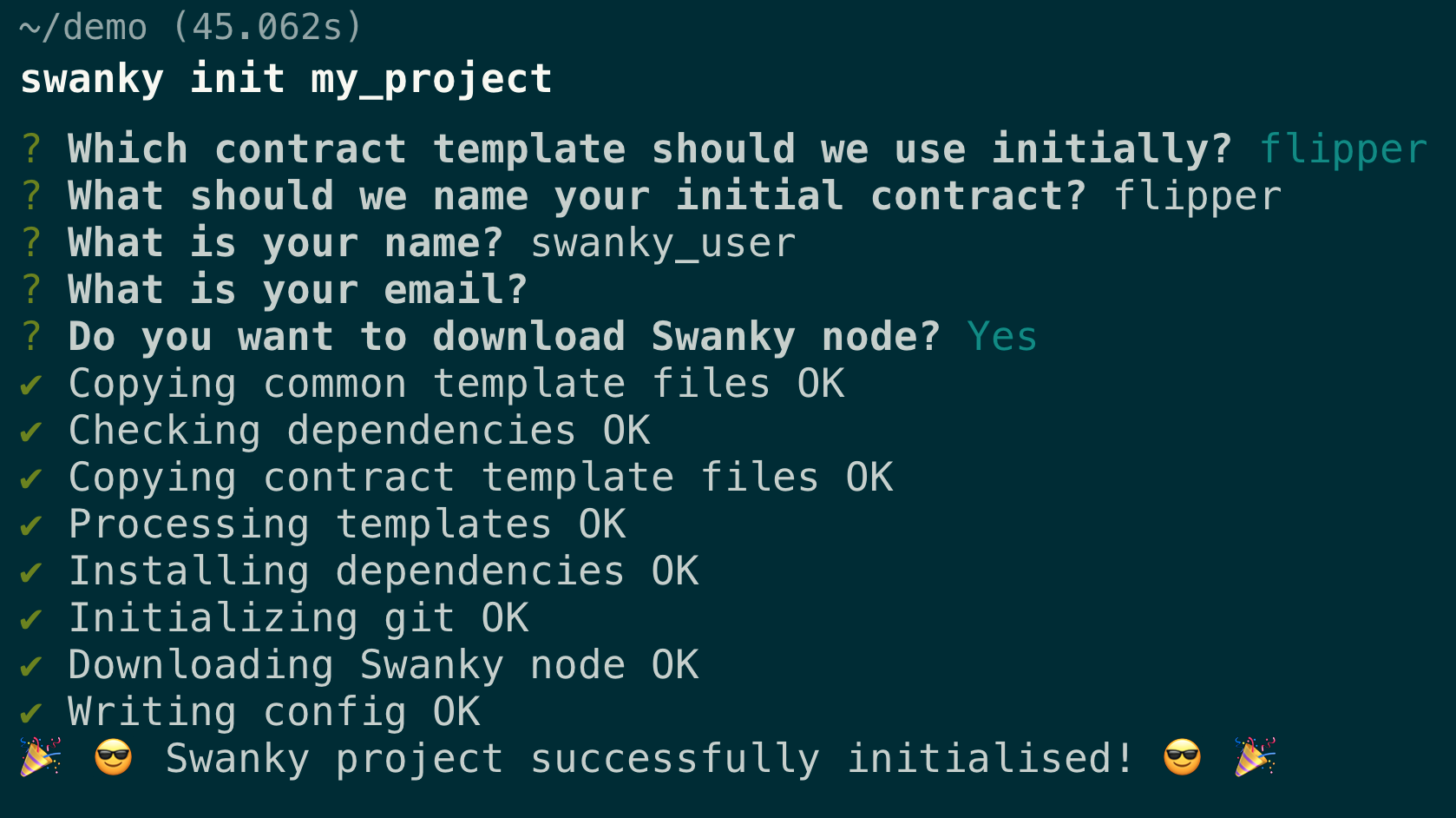 Using the swanky init command, you'll be prompted for a series of answers to define your project and the first smart contract within it.