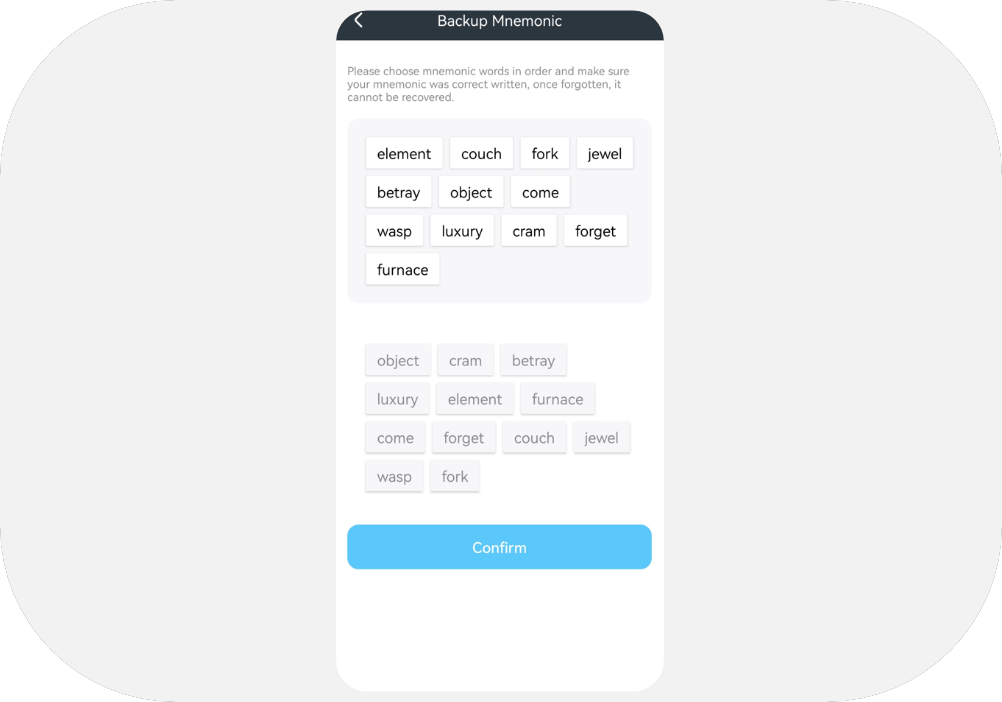 - On the next screen, verify that you have the correct seed phrase and click confirm;
