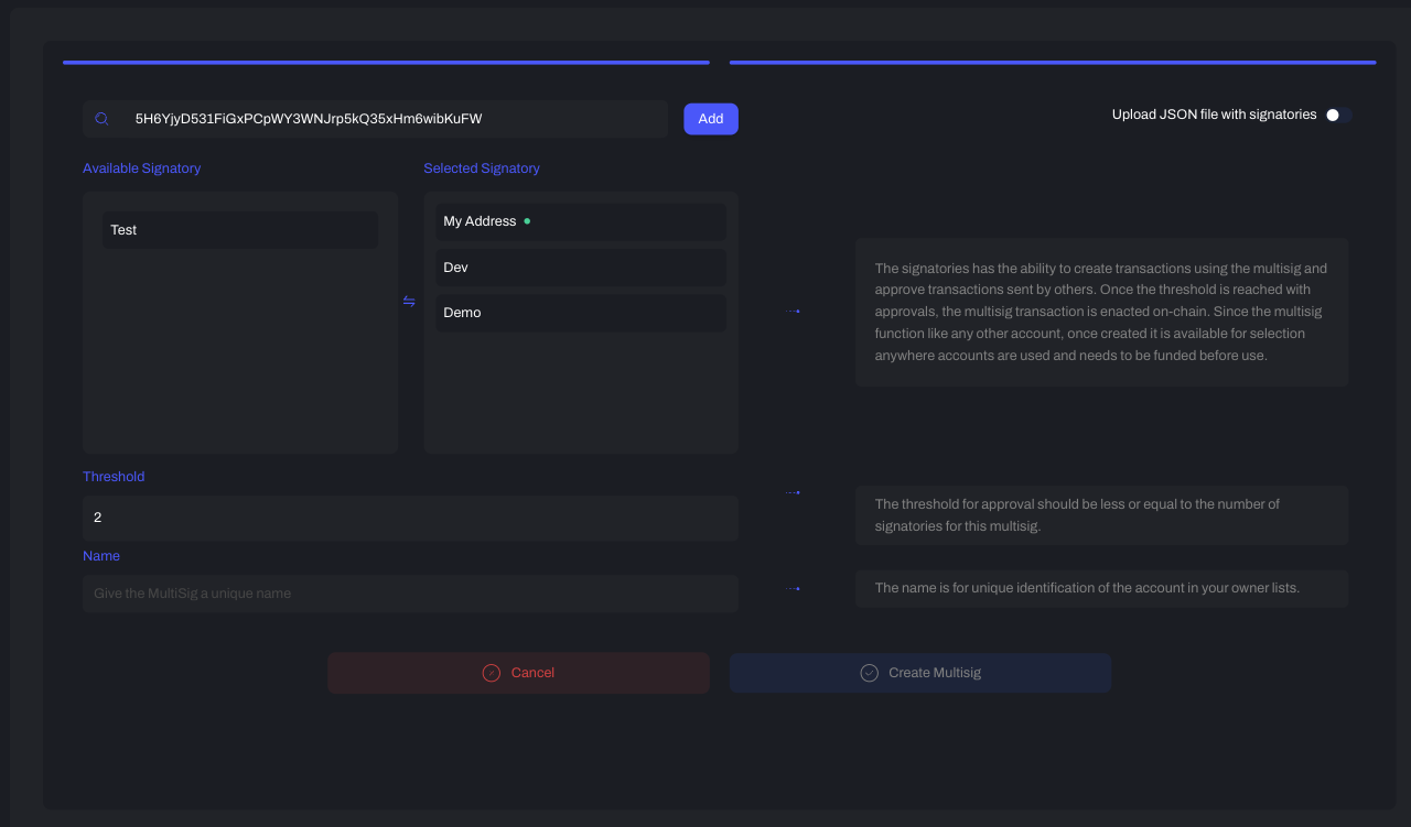 - Choose the signatory addresses to include in the multisig account. You can select from your wallet or add an address manually;