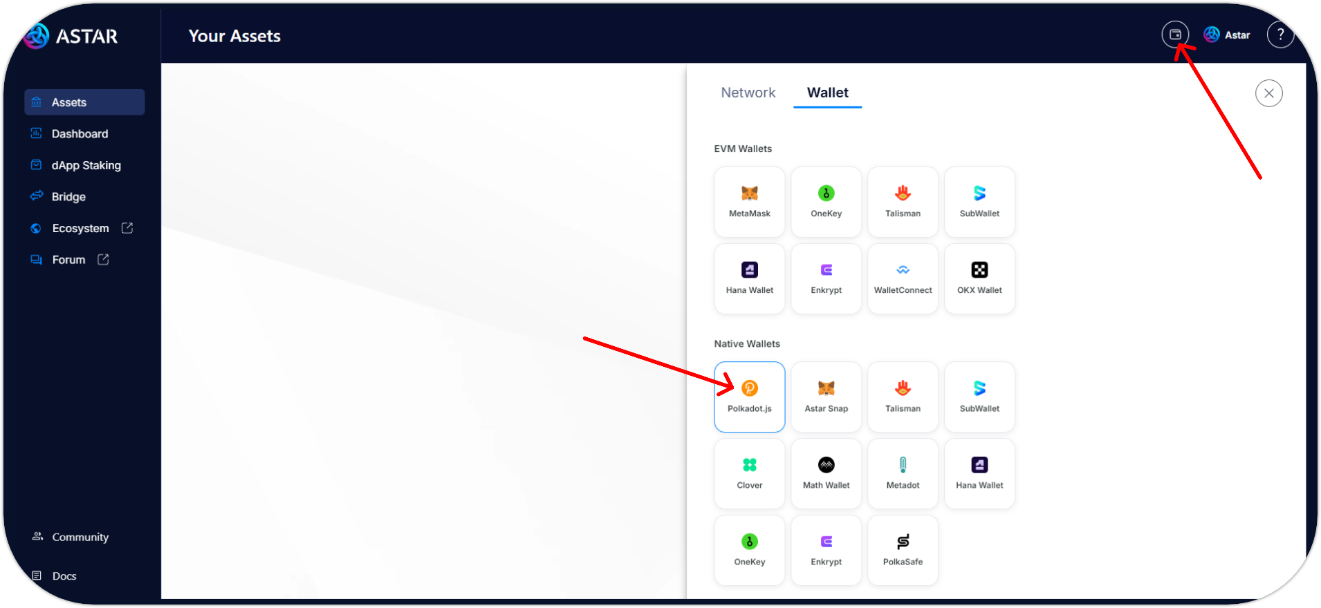 If you can't see your wallet, open the Polkadot.js extension settings and allow the wallet to manage the Astar portal.