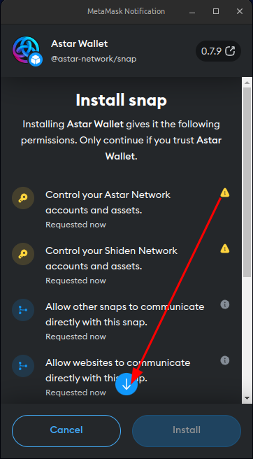 Click the arrow to view the entire list of permissions required by the Astar Wallet snap and, if you accept them, click the MetaMask "Install snap" button labeled "Install" to begin installing the Astar Wallet snap.