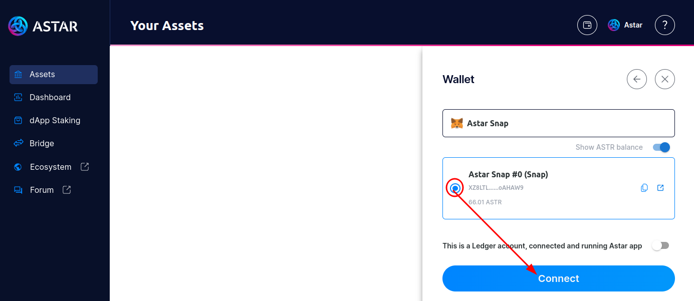 - Go to the Astar Portal and connect using your Astar Snap. Then go to the Transfer section.