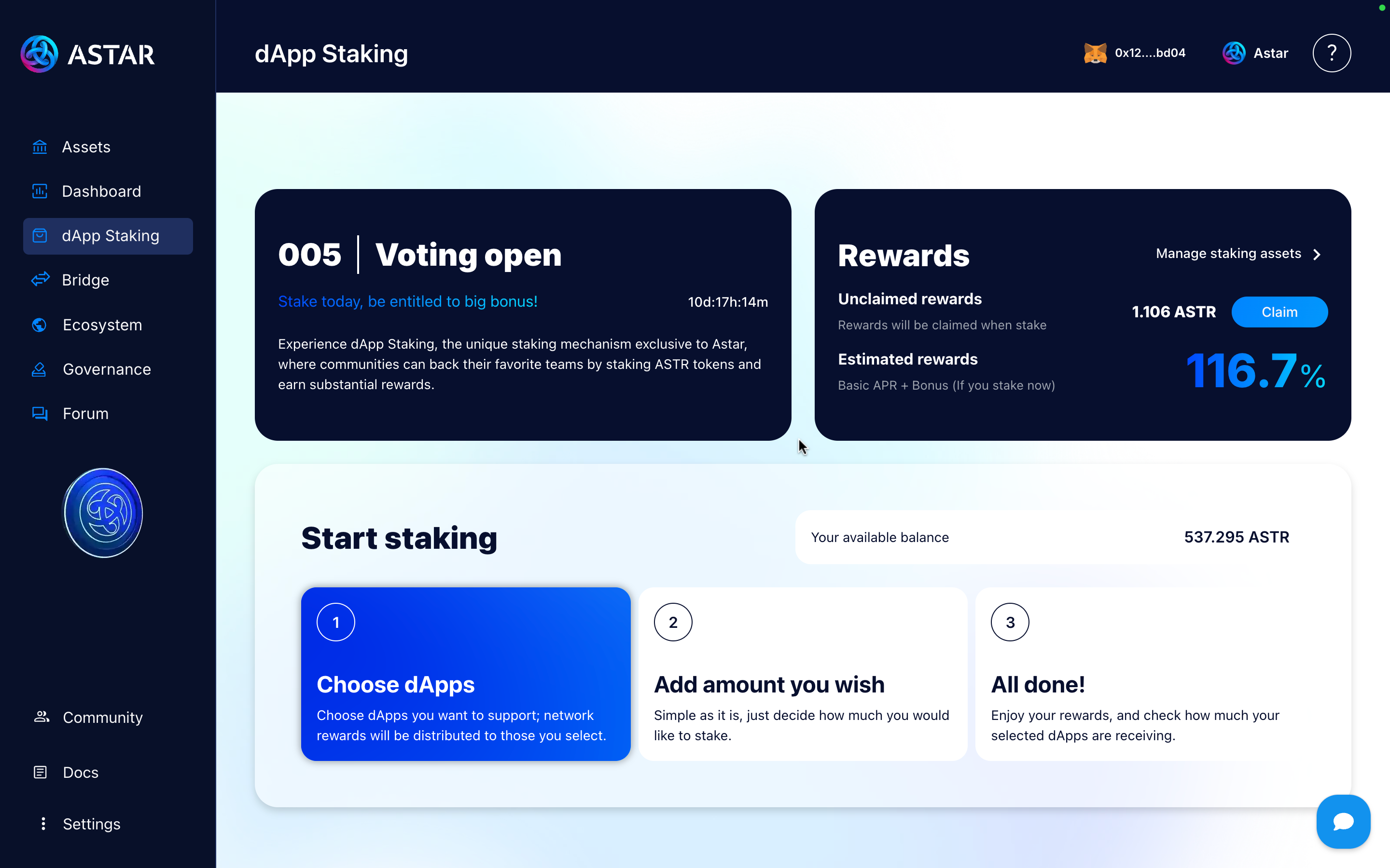 - Minimum of 500 ASTR required to stake